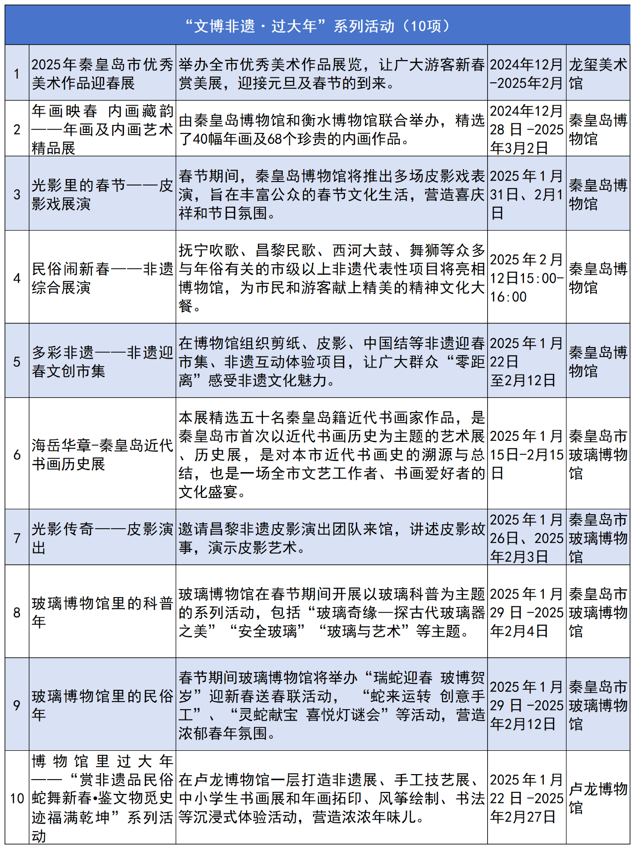 美術(shù)展、書畫展等各類文博展覽以及皮影戲、撫寧吹歌、昌黎民歌、西河大鼓等眾多年俗非遺項(xiàng)目,讓市民、游客感受秦皇島傳統(tǒng)年俗的魅力。
