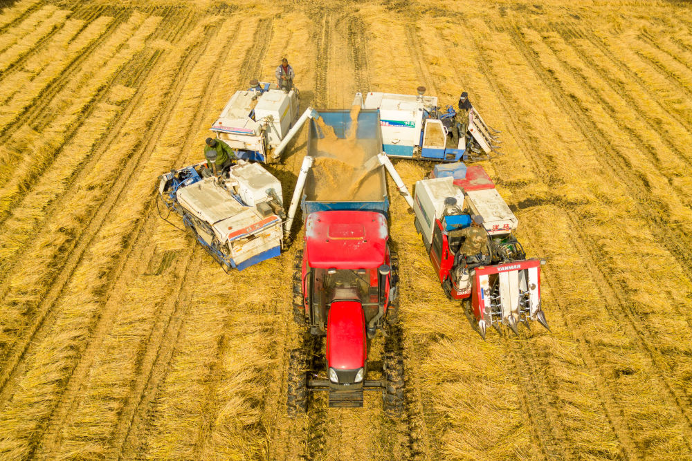 2024年10月13日,在黑龍江省綏化市北林區(qū)雙河鎮(zhèn),村民駕駛收割機進行卸糧作業(yè)(無人機照片)。新華社記者 張濤 攝