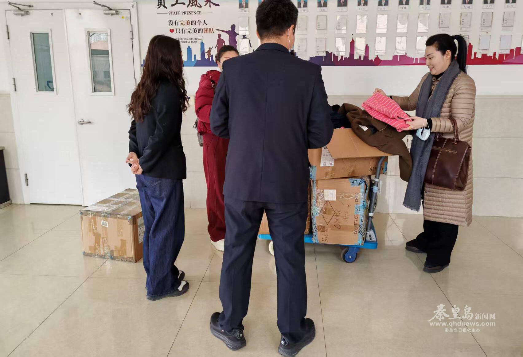 海港區(qū)新世紀(jì)社區(qū)居委會工作人員與愛心人士將捐贈的衣物送到市社會福利院。