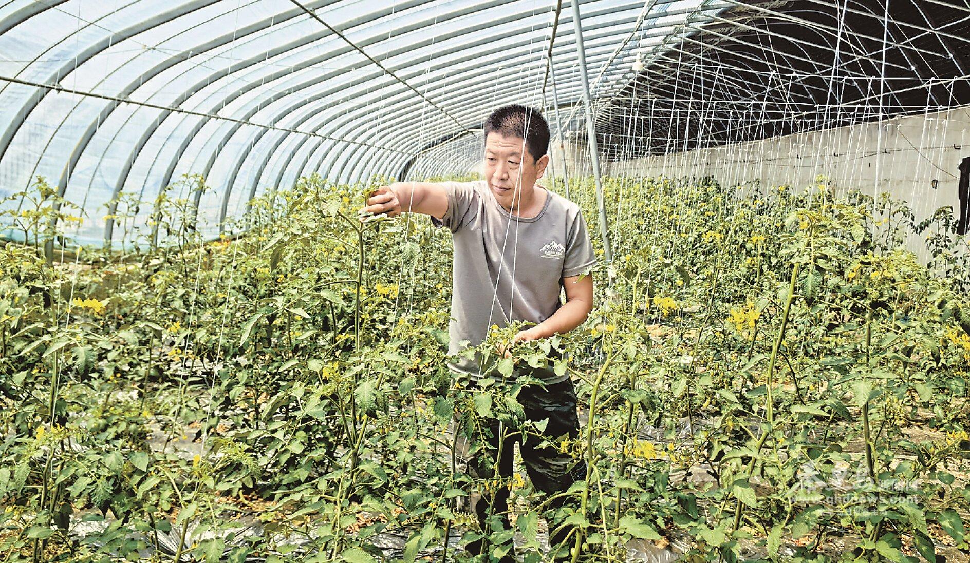 青龍河村村民郭保軍正在為西紅柿藤蔓打尖。河北日?qǐng)?bào)記者孫也達(dá)攝