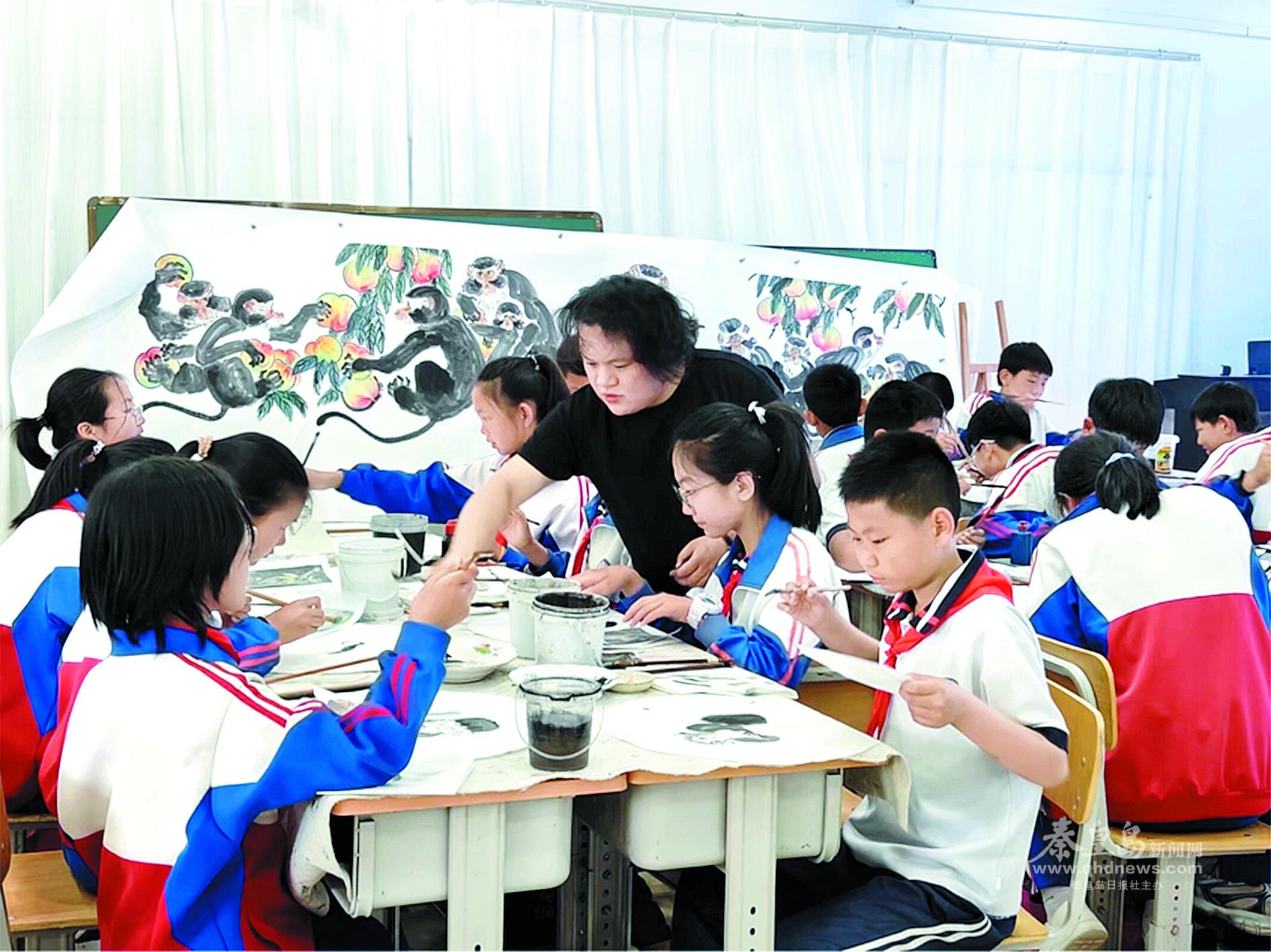 在畫(huà)社里,彭燁系統(tǒng)講授國(guó)畫(huà)、書(shū)法和篆刻等傳統(tǒng)藝術(shù)。隨著課程深入,一批有天賦的孩子漸漸嶄露頭角。她讓這些孩子當(dāng)“小老師”上臺(tái)示范,課間帶大家用畫(huà)筆美化校園墻面,把空白墻壁變成“童話森林”;課余時(shí)間組織孩子們布置展室,陳列“兒童生活水墨”“鄉(xiāng)土篆刻”等作品。