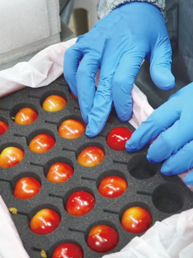 被選中的櫻桃一顆一顆放入有著果實(shí)和果蒂形狀的海綿中,朱海洋介紹包裝的細(xì)節(jié)考慮:“這是環(huán)保無異味海綿,尺寸精準(zhǔn),確保運(yùn)輸過程中不晃動(dòng),不然櫻桃容易花臉兒。”