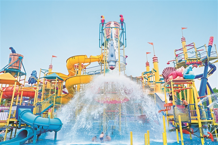 追求刺激的年輕人在“超級(jí)旋風(fēng)浪擺”的90度垂直滑道上挑戰(zhàn)失重的快感。兒童水樂(lè)園里,彩色滑梯直沖入水,小游客們勇敢挑戰(zhàn)。“水上項(xiàng)目按年齡分階段設(shè)計(jì),為了提升游客體驗(yàn),我們要讓大人孩子都能玩,都玩得盡興才好?!睒?lè)島海洋王國(guó)總經(jīng)理?xiàng)顜浕⒌莱隽嗽O(shè)計(jì)理念。