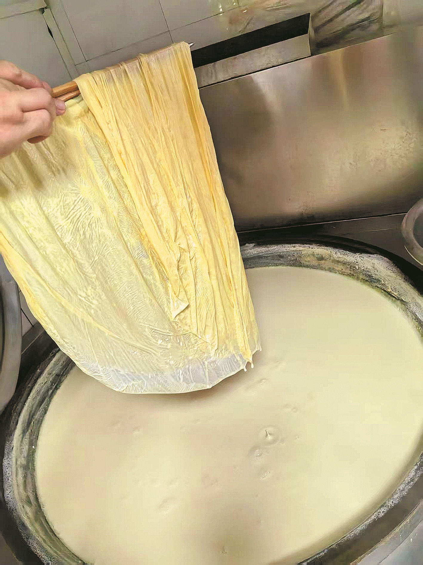 “豆?jié){在桶內(nèi)靜置十幾分鐘后,表面會(huì)形成一層薄薄的凝結(jié)物,這就是豆皮。揭豆皮也很簡單,不熟練或者豆皮面積大的時(shí)候,拿根細(xì)棍子伸到豆皮下面,輕輕往上一挑,一張豆皮就揭下來了?!眲⒑FG用手比畫了一下:“豆皮揭下來后,短時(shí)間晾曬一下就行了?!卑敫傻亩蛊ふ郫B后不破不碎,表面一層油光,聞起來豆香四溢,但這種豆皮因不易存儲(chǔ),須盡快食用。