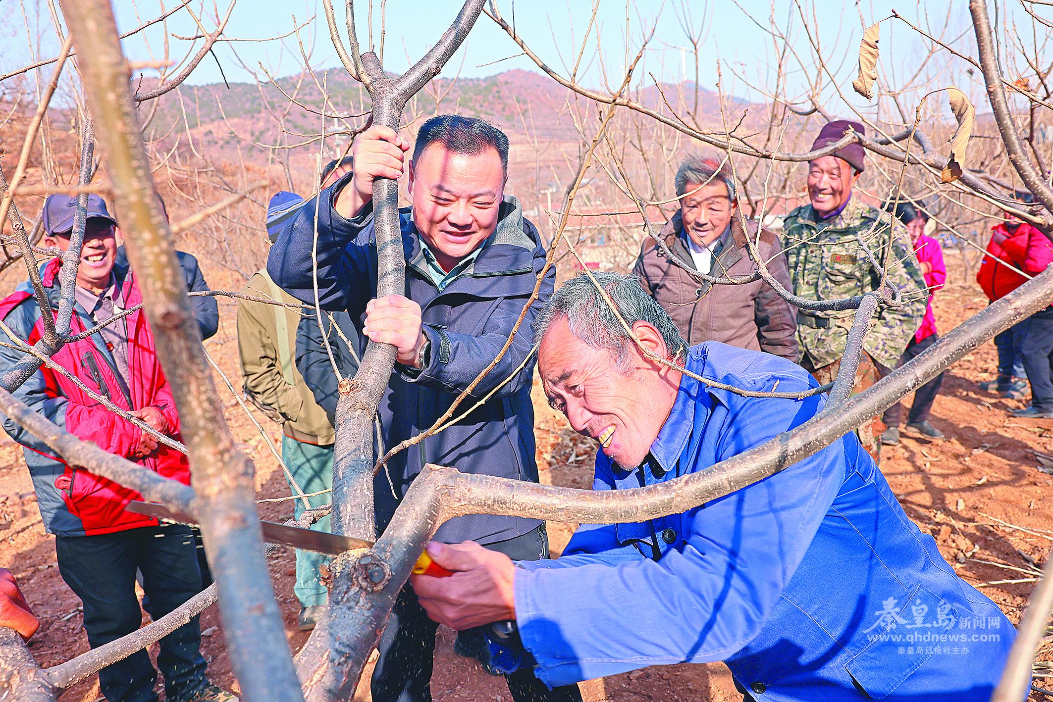 秦皇島日報社駐西螞蟻灘村工作隊隊員(左二)查看板栗樹剪枝情況。 (圖片由駐村工作隊提供)