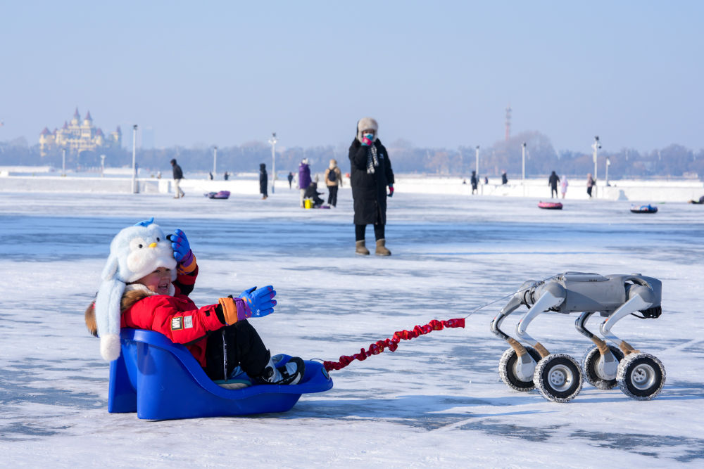 1月11日,小朋友在松花江哈爾濱段江面上體驗機(jī)器狗拉爬犁。新華社記者 王建威 攝