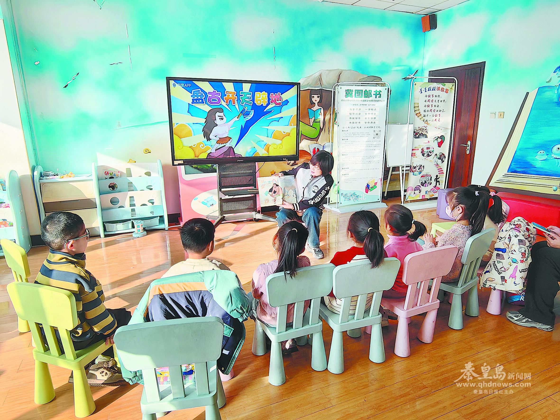 在神話故事會(huì)上,老師給小讀者講《盤古開天辟地》的故事。