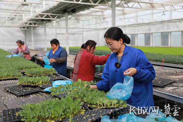 滄州市肅寧縣綠苑蔬菜專業(yè)合作社負(fù)責(zé)人張莎莎(右)與工人一起裝苗。長城網(wǎng)·冀云客戶端記者 李佳琦 攝